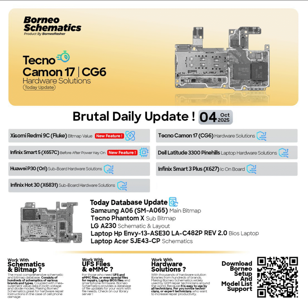 Today, on October 4th, 2025, the Borneo Brutal Update brings a wide range of solutions for top devices like Tecno Camon 17, Infinix Smart 5, Huawei P30, Samsung A06, and many more. In this post, we will highlight all the major updates, explain why these schematics are important, and share the official links where you can download and learn more.