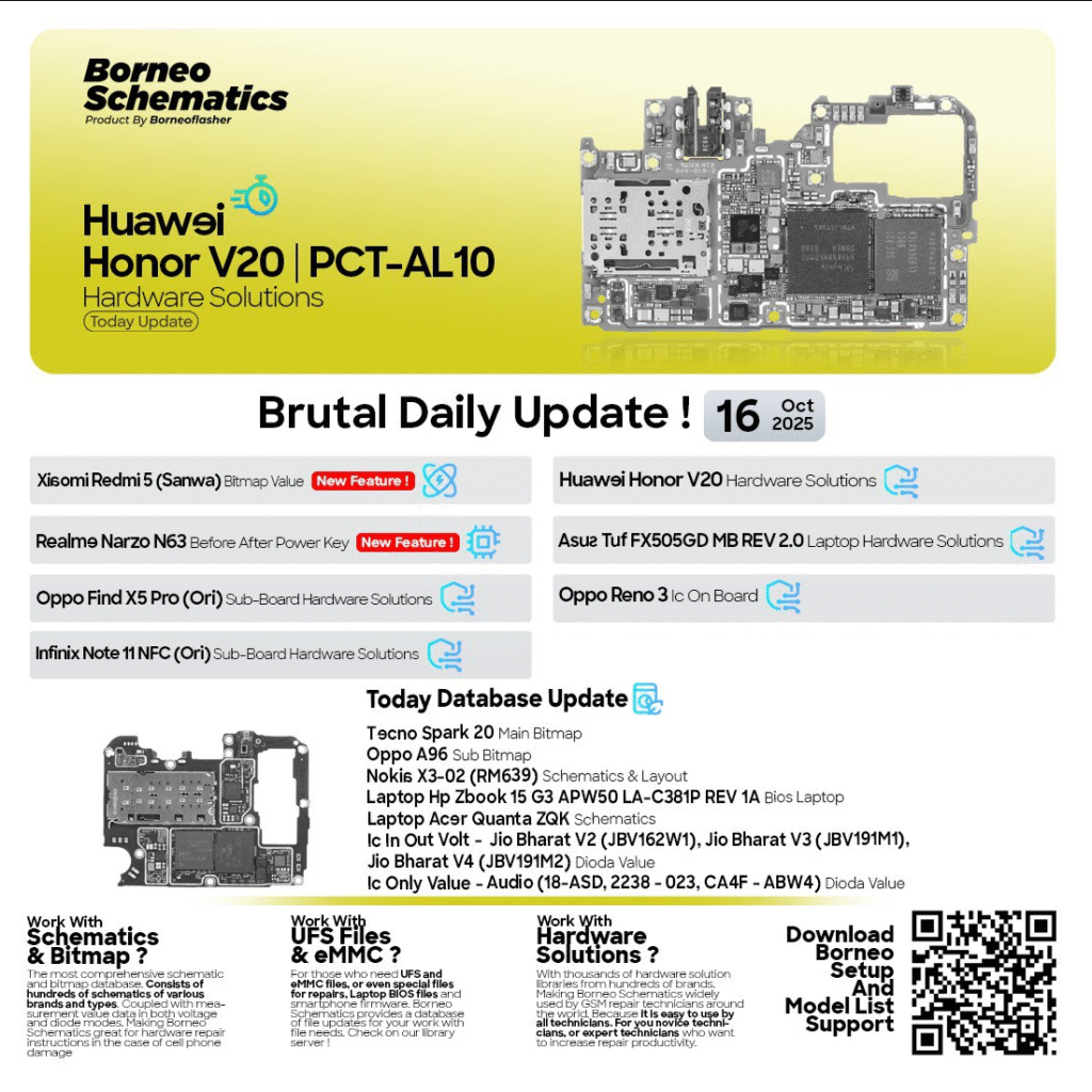Borneo Schematics Today Update delivers daily repair data and schematic solutions that help technicians repair mobile phones, laptops, and other smart devices quickly and accurately. Known globally for its detailed schematics, board diagrams, and tested solutions, Borneo Schematics has become a trusted daily tool for mobile repair professionals.