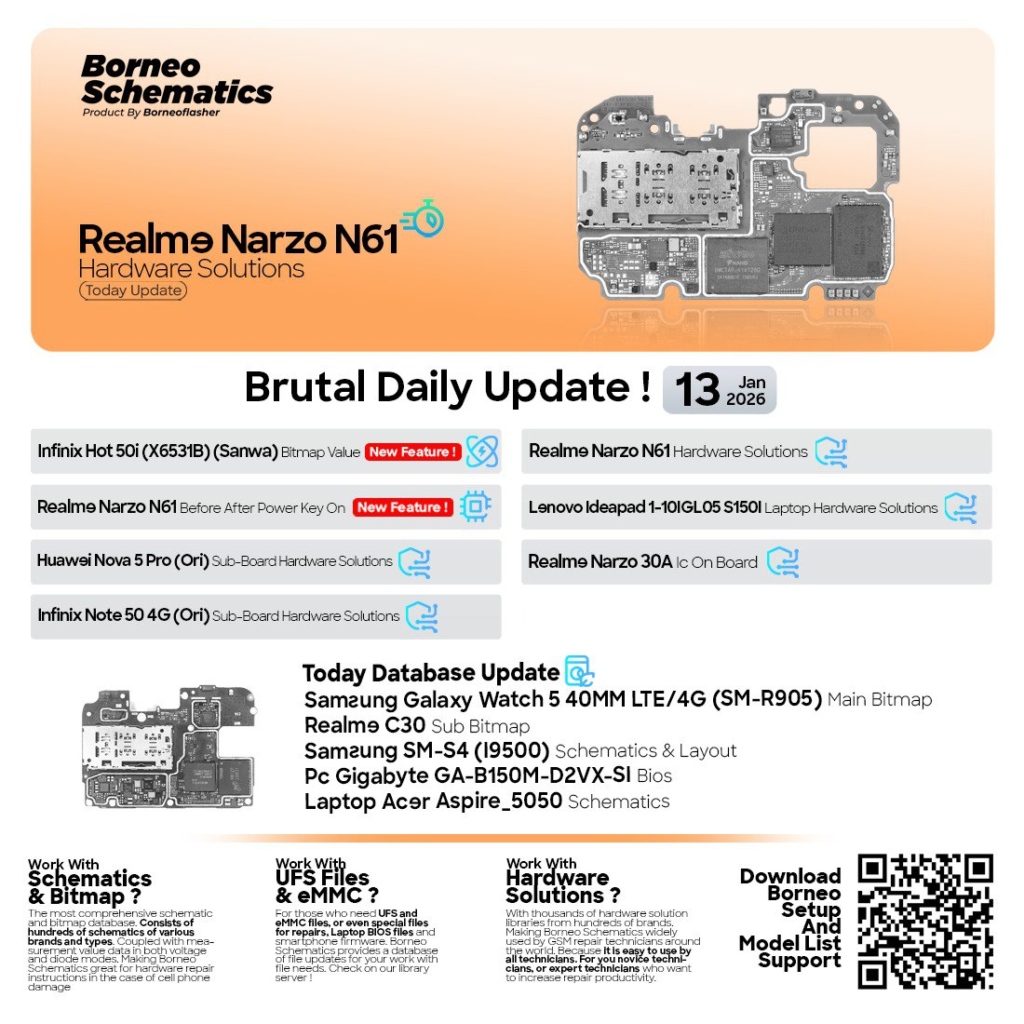 Borneo Schematics Today Update 2026 provides the latest mobile and laptop schematics, bitmap files, motherboard solutions, and BIOS data on a single platform. Whether you are fixing a Realme Narzo N61 power key issue, checking an Infinix Hot 50i bitmap value, or downloading a Lenovo Ideapad 1-10IGL05 schematic, Borneo ensures you always work with reliable and updated information.